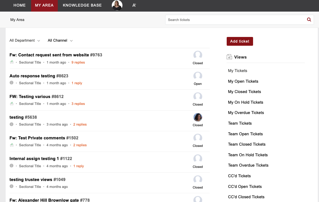 You can view, open and reply to tickets from within the MY AREA section.