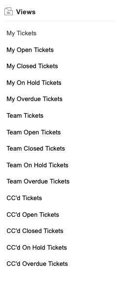 On the far right, are alternative ticket views, which can either refine your list to something more specific, such as My Open Tickets or My Overdue tickets. You will also note a few CC views. This is a applicable if you have been cc'd in on a ticket. That ticket then won't show under the My Ticket view - you would need to navigate to CC'd or one of the other CC views.